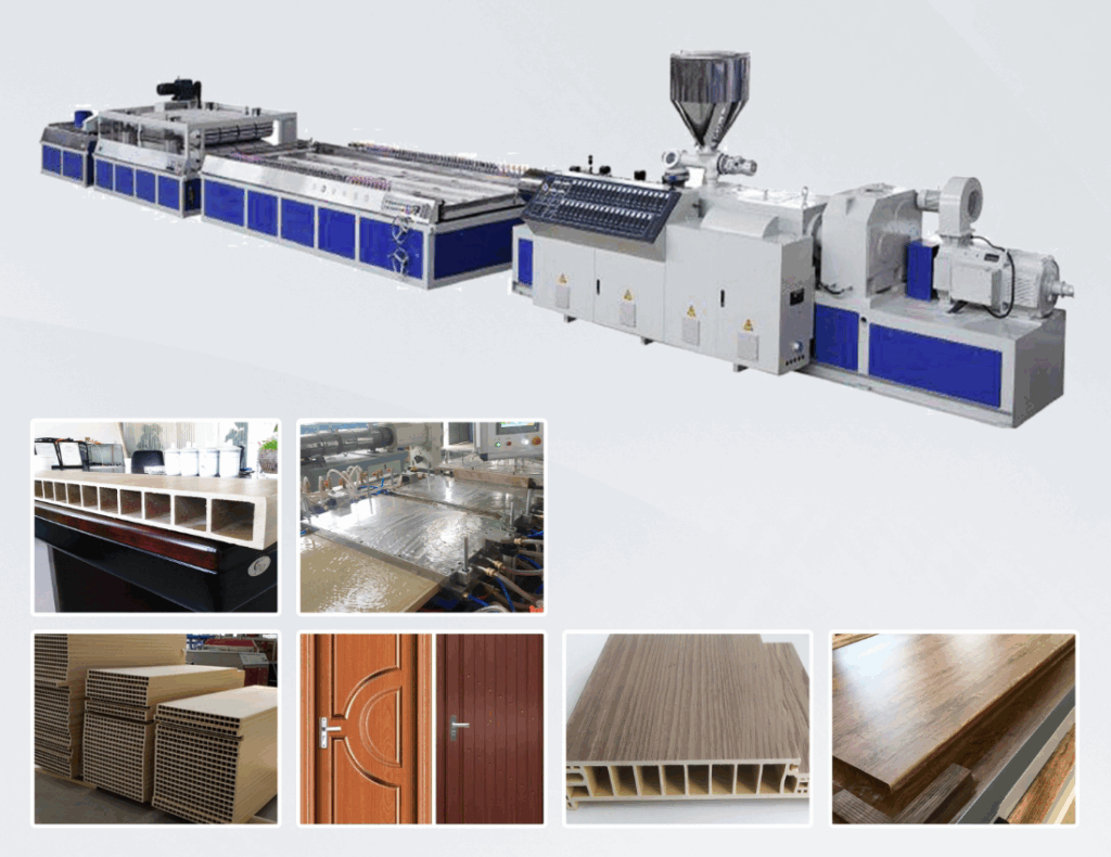 Linia produkcyjna składa się ze stożkowej wytłaczarki dwuślimakowej, platformy do kalibrowania próżniowego, traktora, maszyny tnącej, układarki itp. Urządzenie charakteryzuje się niezawodną wydajnością i wysoką wydajnością produkcji. Surowiec wytwarzany jest metodą mieszania PVC z proszkiem drzewnym, o szerokości 700-1100 mm i grubości 20-45 mm. Powierzchnia może być powlekana, rzeźbiona, malowana, osadzana w szkle itp. Różnorodne wzory modelowania! Urządzenia linii wytłaczania wykorzystują programowalny komputer lub lokalny system sterowania. Drzwi z WPC PVC charakteryzują się wodoodpornością, ognioodpornością, odpornością na mole i nieodkształcaniem, co czyni je szeroko stosowanymi w sypialniach, łazienkach, kuchniach, willach, domach mieszkalnych, hotelach, szkołach, szpitalach itp.