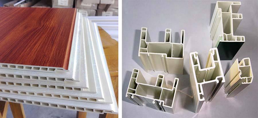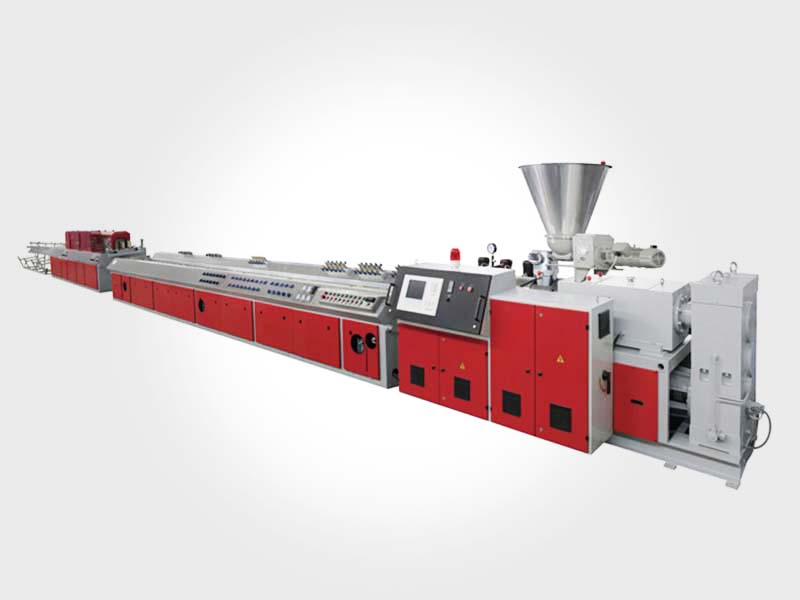 Podajnik → Stożkowa wytłaczarka dwuślimakowa → Forma → Stół kalibracyjny → Odciąganie → Obcinak → Układarka